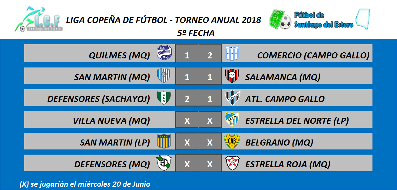Este sábado 16 de Junio se disputó parcialmente la 5ª fecha del Torneo Anual 2018 de la Liga Copeña de Fútbol, los partidos se jugaron el sábado para evitar la competencia el domingo día del padre.